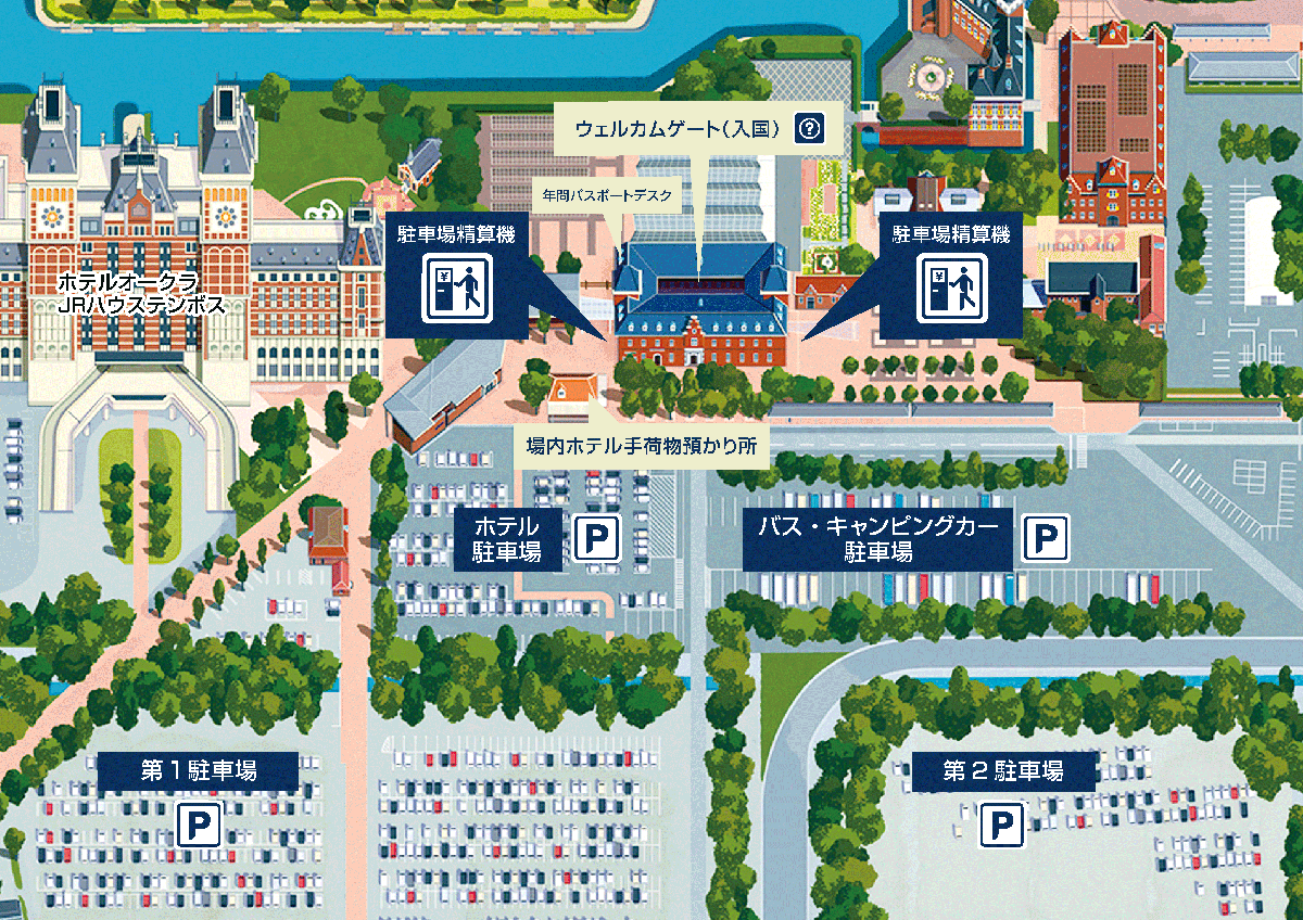 หากคุณเดินทางมาที่ Harbor Zone โดยรถยนต์ คุณสามารถใช้ที่จอดรถ Harbor ของ Huis Ten Bosch ได้ (100 เยน/ชั่วโมง)