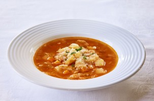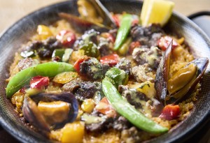 เสิร์ฟพร้อมไส้กรอกและใบอ่อนซุปกงฟีต์หมูอาหารทะเล Paella บริการนี้อาจไม่สามารถใช้ได้ในช่วงเวลาที่มีการจราจรคับคั่ง