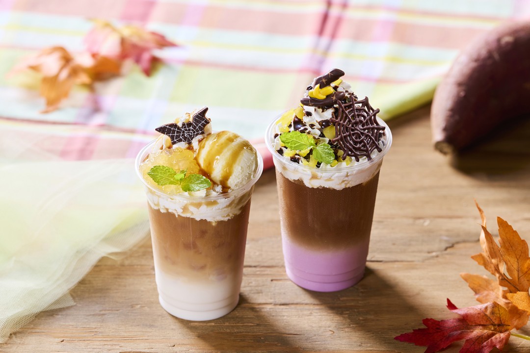 เราขอเสนอชานมไข่มุก (ซ้าย) ที่มีกลิ่นหอมคาราเมลและความหอมหวานของนม และ Cafe au lait สองชั้นสุดลึกลับ (ขวา) ที่ให้คุณได้เพลิดเพลินไปกับความหวานและกลิ่นหอมของมันหวาน
