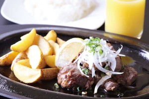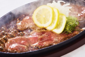 เนื้อสเต็กหั่นเป็นชิ้นบาง ๆ วางบนจานเหล็กร้อนและราดด้วยซอสมะนาวสูตรพิเศษ