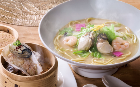 九州産牡蠣の旨味を存分に引き出した、冬限定のおすすめちゃんぽん。肉汁あふれる牡蠣シュウマイとのセットで、贅沢な味わいをお楽しみいただけます。 価格:2,200円
