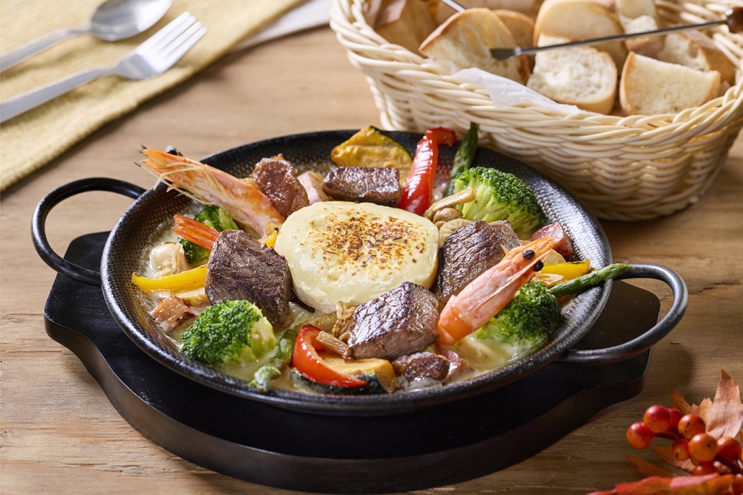 ชีสฟองดูว์นี้ทำโดยการย่างชีส Camembert ทั้งลูกจากจังหวัดคุมาโมโตะ แล้วเสิร์ฟพร้อมวัตถุดิบหลากสีสันในสไตล์ปาเอญญ่า เป็นเมนูที่จะทำให้คุณอบอุ่นทั้งกายและใจ
