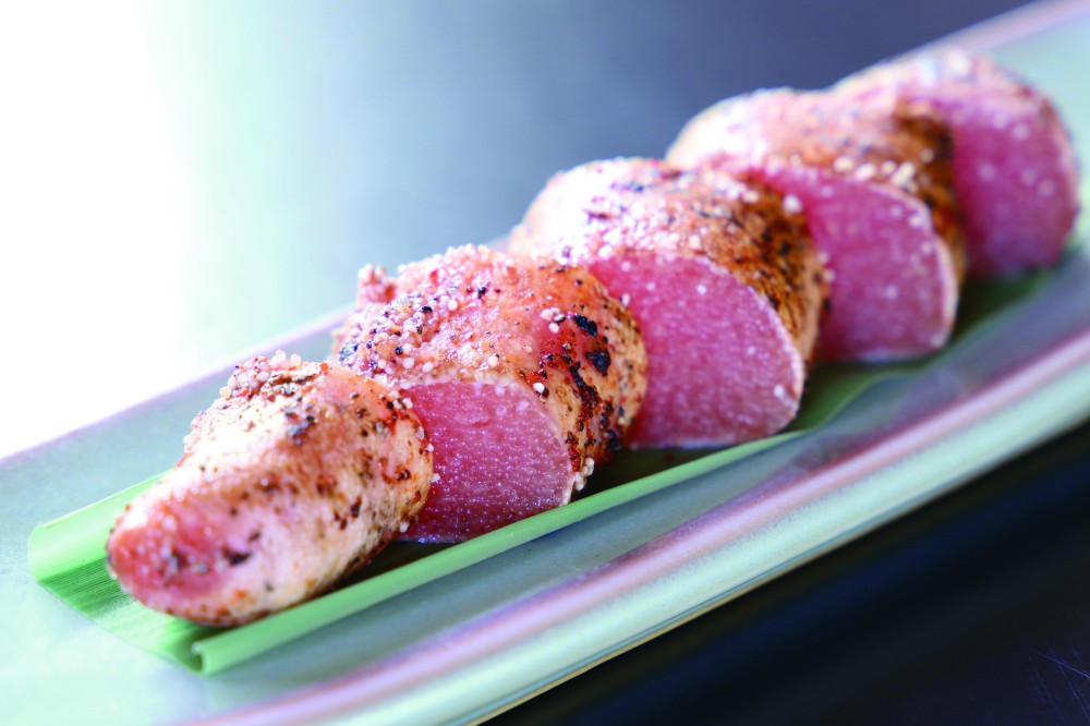 長崎真鯛をさまざまなお召し上がり方で お楽しみいただけます。 ■長崎真鯛漬け炙り ■長崎真鯛塩麹刺身 ■野菜天ぷら ■佐世保世知原茶 ■漬物 ■長崎真鯛鯛わた