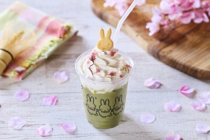 มัทฉะลาเต้หน้าตาน่ารักนี้ ตกแต่งด้วยดอกซากุระโรยเกลือ ทำให้คุณรู้สึกถึงการมาถึงของฤดูใบไม้ผลิ