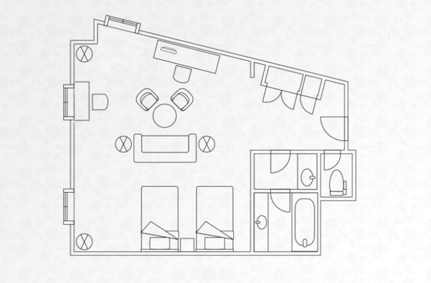 ห้องนี้เป็นห้องขนาด 55 ตร.ม. ซึ่งตั้งอยู่ในห้องหัวมุมบนชั้น 2 ถึงชั้น 4