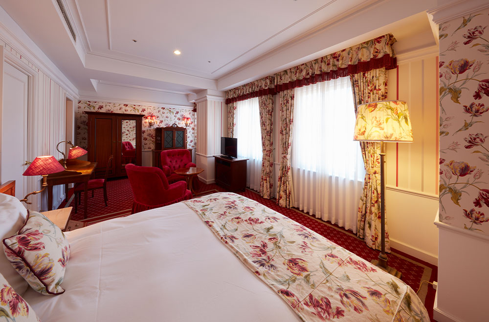 ตกแต่งด้วยเฟอร์นิเจอร์ยุโรปโอ่อ่า ขนาดเตียงเป็นแบบกึ่งเตียงคู่