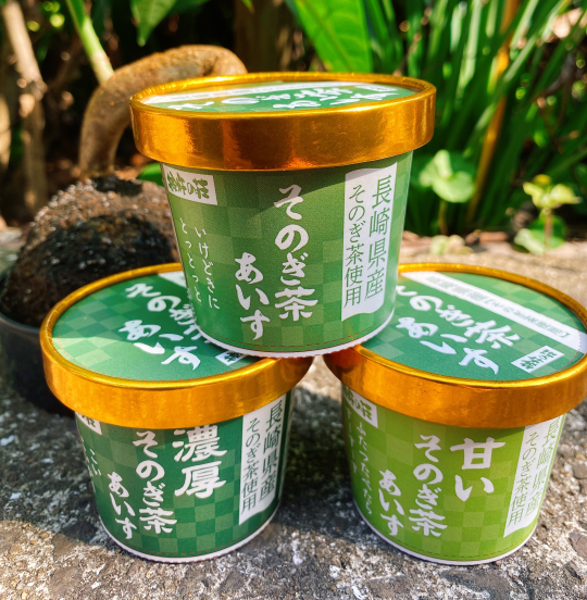 長崎県東彼杵(ひがしそのぎ)のお茶を使用したそのぎ茶あいす! 普通・甘い・濃厚の3種の味から選べます♪ さっぱりした甘さと、お茶の香りが楽しめる大人のあいす。